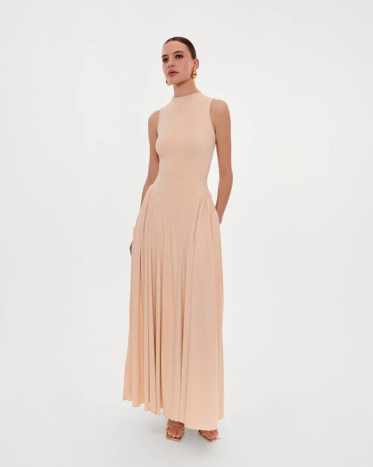 فستان ماكسي أنيق بياقة عالية على الطراز الباريسي، يتميز بتصميم راقٍ بلا أكمام مع تنورة...