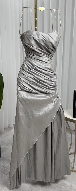✨ Grace in silver elegance! Make a lasting impression with this stunning silver evening gown, designed with a strapless sweetheart neckline and a flattering body-hugging fit. Its subtle draping and soft layers add graceful movement, making it perfect for galas, weddings, and formal events.