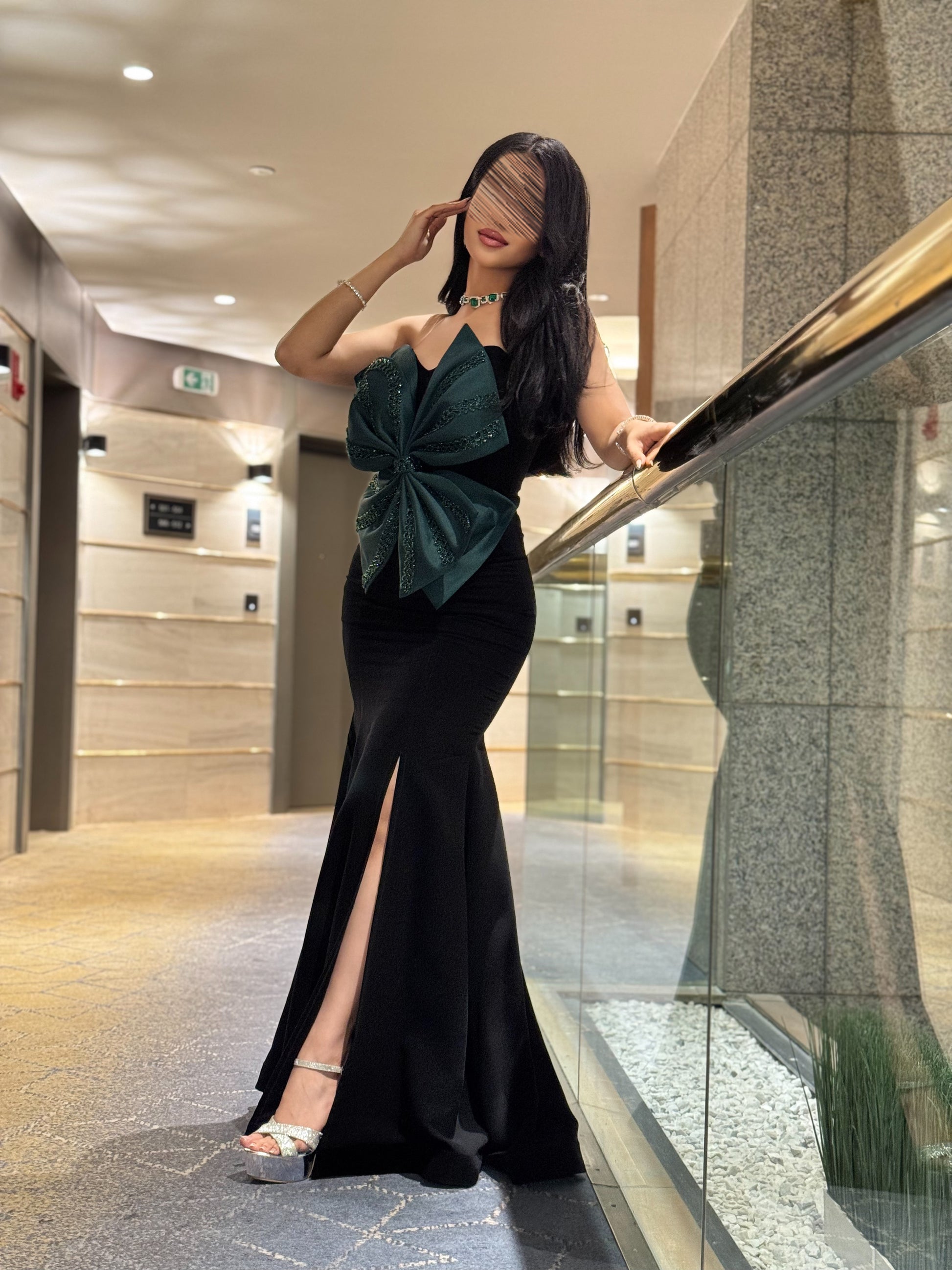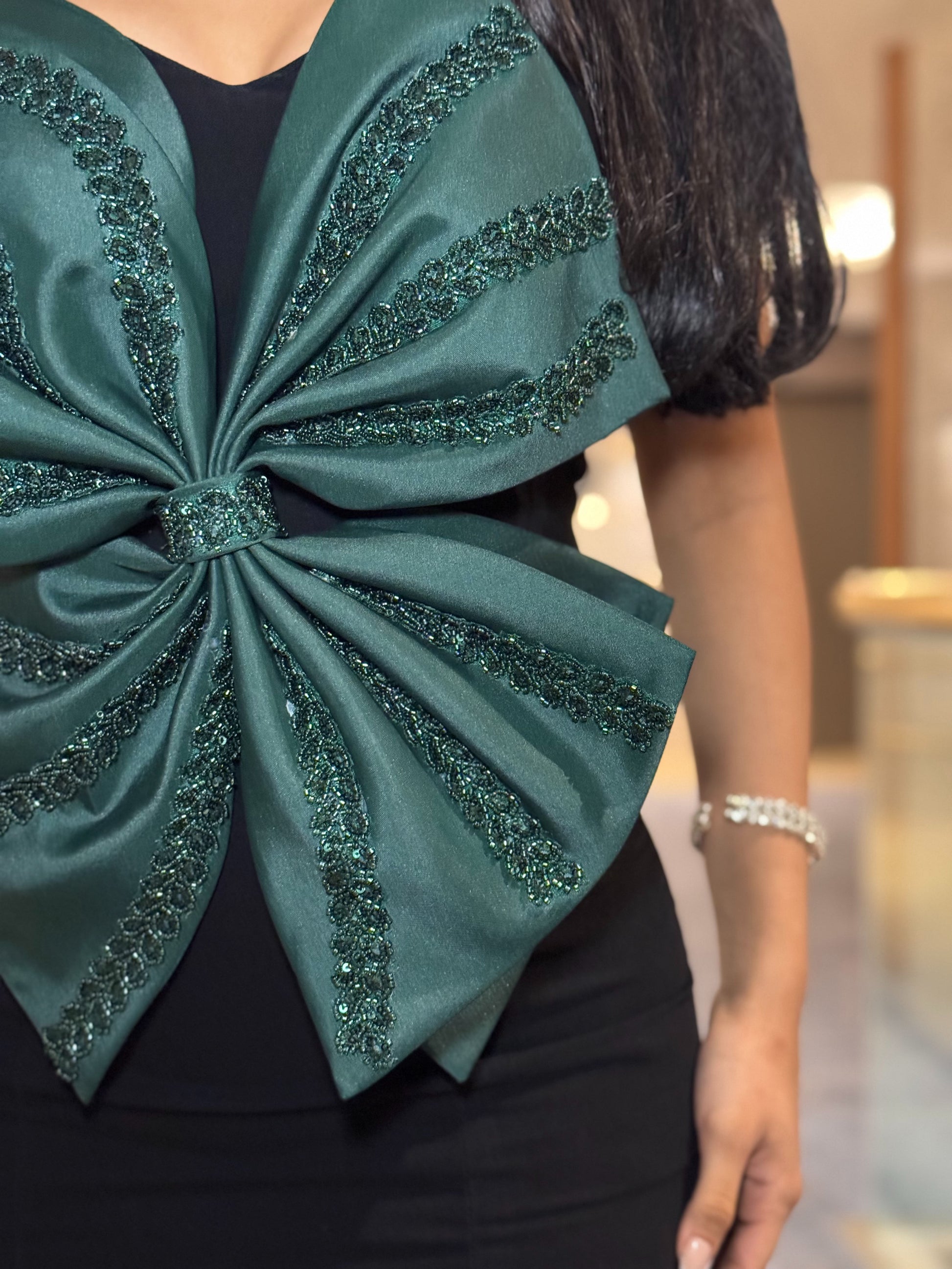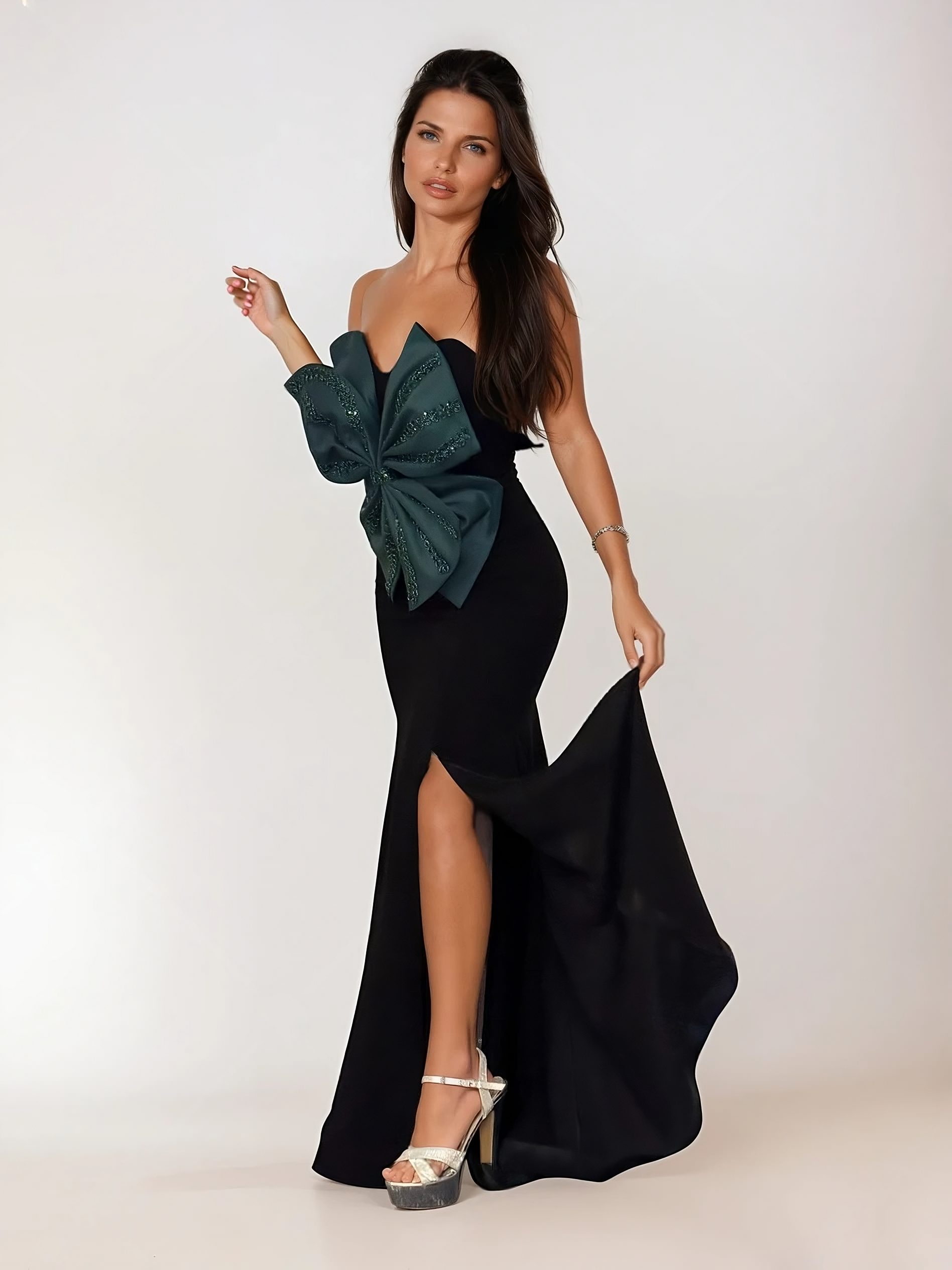 Turn heads with this bold and sophisticated black evening gown. Tailored in a flattering mermaid silhouette, this dress features a luxurious oversized green bow at the front, delicately embroidered for added elegance. The structured fit accentuates the curves, while the front slit adds both style and comfort.