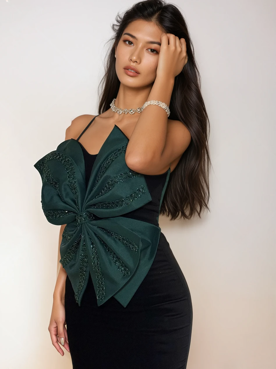 This gown is the perfect choice for those seeking a bold and elegant look. The striking green bow and meticulous design make it a work of art, ideal for standing out at grand events.